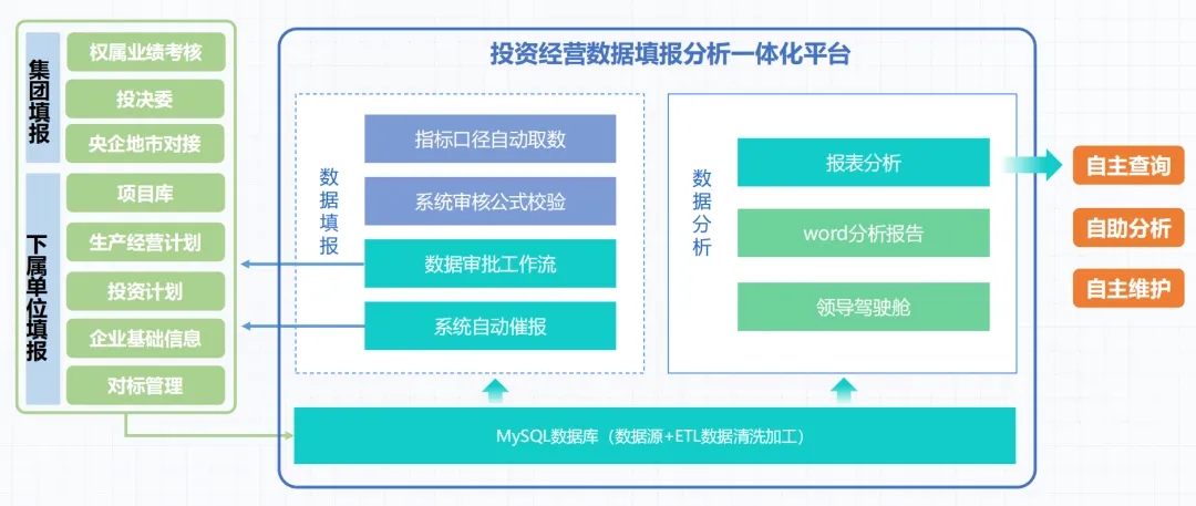 經(jīng)過(guò)多次調(diào)研,某投資集團(tuán)最終選擇攜手億信華辰開啟數(shù)字化轉(zhuǎn)型之路,搭建投資經(jīng)營(yíng)數(shù)據(jù)填報(bào)分析一體化平臺(tái)。根據(jù)某投資集團(tuán)要求、戰(zhàn)略發(fā)展部日常工作性質(zhì)和實(shí)際上報(bào)國(guó)資委的需求,將適合數(shù)據(jù)化管理的、數(shù)據(jù)量大的、可量化的工作事項(xiàng),納入此次數(shù)據(jù)平臺(tái)的建設(shè)范疇,實(shí)現(xiàn)數(shù)據(jù)存儲(chǔ)、數(shù)據(jù)填報(bào)、在線審批、數(shù)據(jù)分析等功能 。