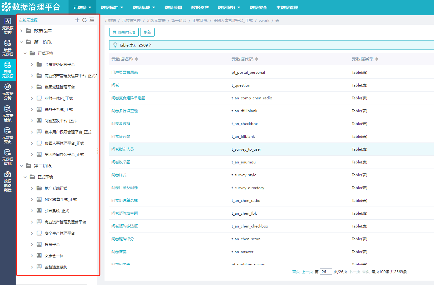 通過元數據管理,完善數據的屬性信息,幫助用戶更加準確的理解數據,并為數據應用類項目提供完備的數據字典。完成16套系統元數據采集管理,經過各業務系統廠商的補充完善,元數據注釋完備率有較大的提升,由原來37.72%提升至91.17%。累計納管8485張數據表以及159665個數據字段的元數據信息;為集團數據洞察力提升,隱藏數據資產價值挖掘打下堅實基礎。