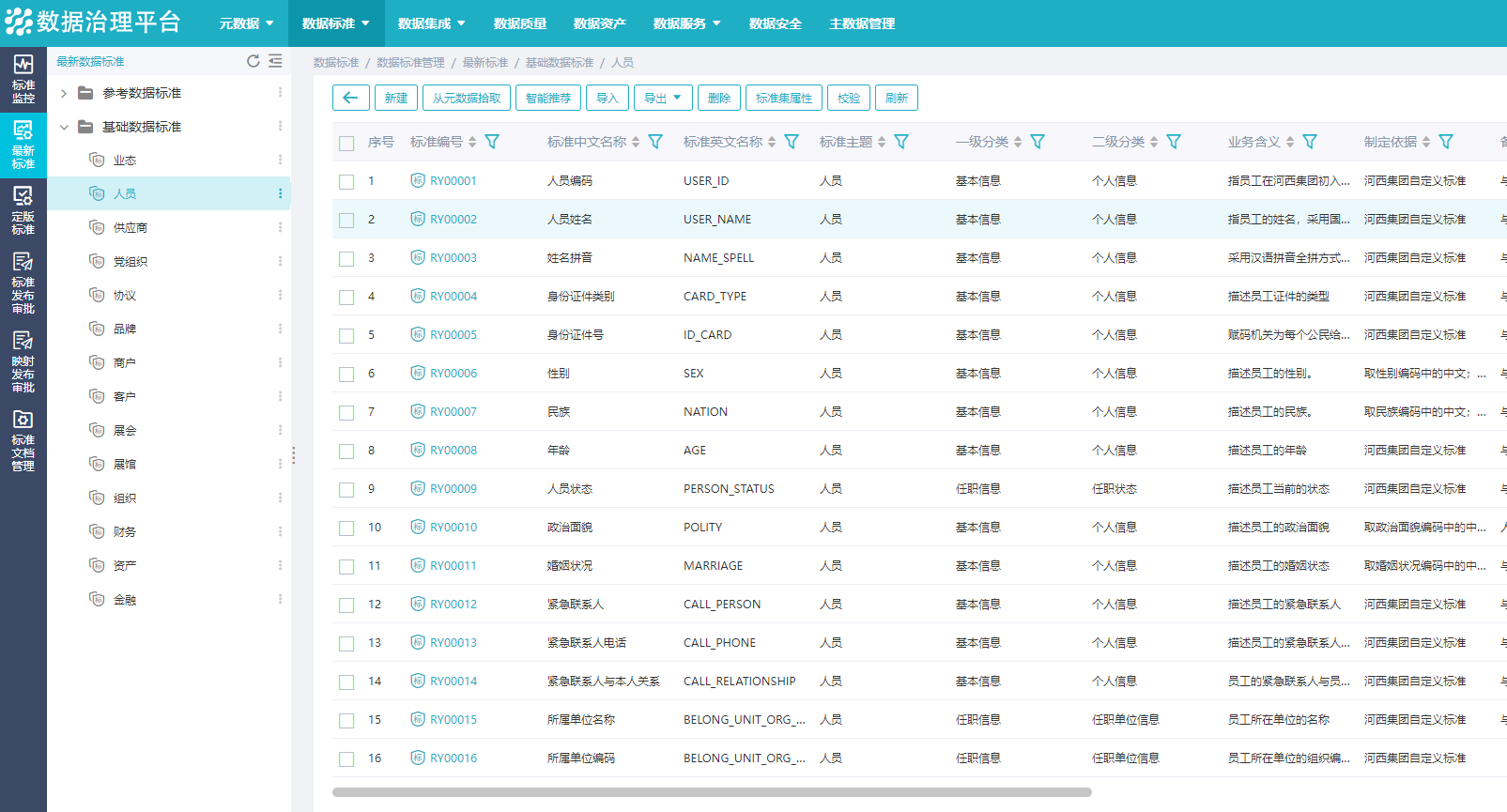 通過數據標準管理,消除跨系統的非一致性,為數據湖倉及數據應用建設提供統一的數據清洗轉換依據。完成基礎標準14個子類,參考標準10個子類,提出相關數模建議,包括486個基礎數據模型、90個參考數據模型。