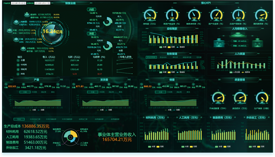 貫徹總體規劃、分步實施的策略,一期貫徹公司數據信息化的方針,把數據信息作為重要的資產來經營,所有的經營數據要實現平臺化管理,逐步取消員工個人數據表單的非協同數據管理方式,重點聚焦財務數據及財務分析,質量、交付、成本等管理重點方面的數據展示和分析報告,以及KPI績效考核方面的分析數據的匯總,重點設計總經理分析決策看板等。