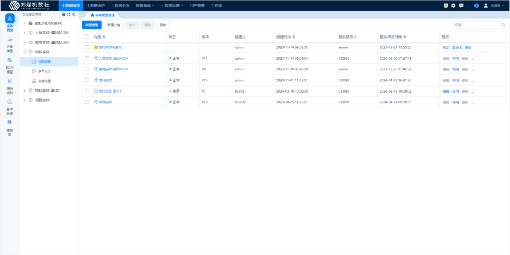 基于已梳理好的物料、人員、組織機構、客戶、供應商、會計科目、項目主數據屬性模板,在平臺完成主數據的模型的創建,規范定義視圖、字段、編碼規則、分類信息,并根據業務場景,完成數據錄入頁面填報表單樣式設計、審批流程設計;對已清洗完成的歷史數據進行快速批量的導入系統,保證初始系統有數據可管、可用。