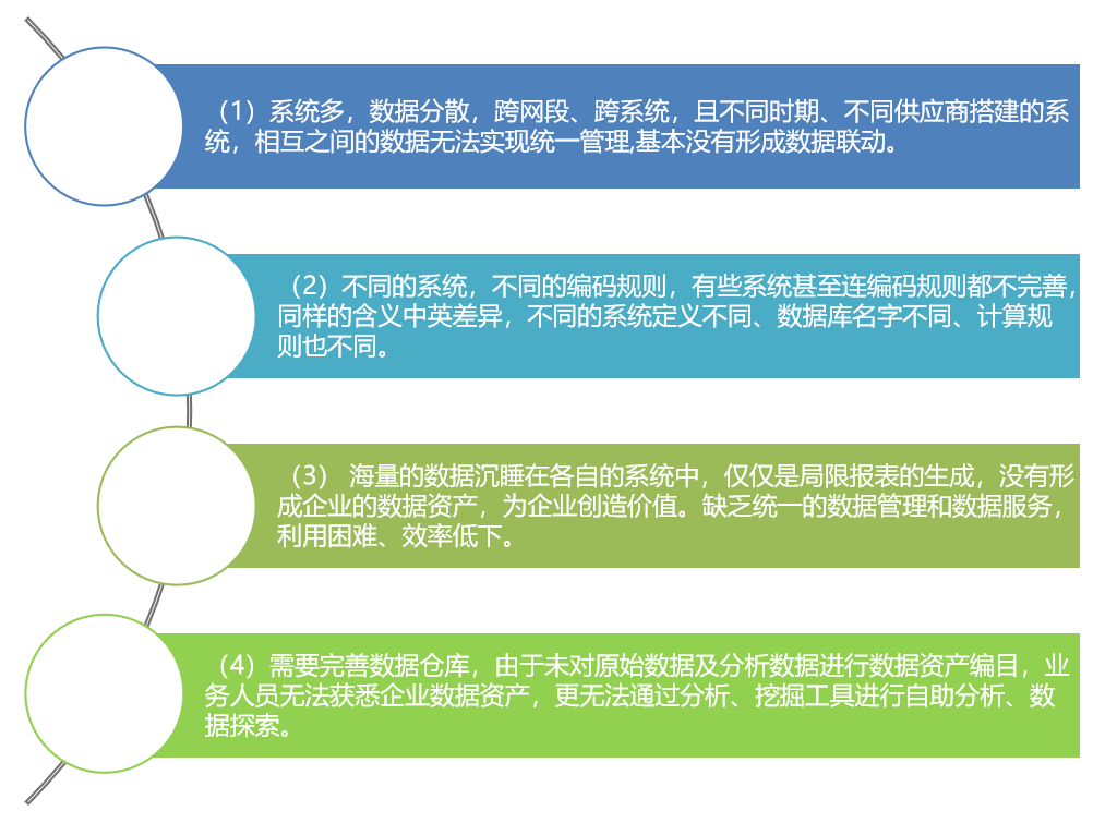 隨著公司業(yè)務(wù)的不斷發(fā)展,各IT系統(tǒng)保存了大量的數(shù)據(jù),但數(shù)據(jù)標(biāo)準(zhǔn)不統(tǒng)一,數(shù)據(jù)共享難度高,數(shù)據(jù)孤島嚴(yán)重,領(lǐng)導(dǎo)層無法看到貫穿各環(huán)節(jié)的全貌數(shù)據(jù)。業(yè)務(wù)人員跨系統(tǒng)、跨專業(yè)線分析難以實(shí)現(xiàn),且不能保證數(shù)據(jù)的準(zhǔn)確性。IT人員缺乏統(tǒng)一的數(shù)據(jù)管理工具支撐各IT系統(tǒng)數(shù)據(jù)整合。