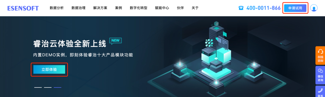 為了能夠讓更多小伙伴更簡(jiǎn)單地體驗(yàn)睿治,億信華辰在官網(wǎng)上線了云體驗(yàn)功能,無(wú)需部署,即可在線體驗(yàn)睿治10個(gè)產(chǎn)品功能模塊,注冊(cè)即可免費(fèi)體驗(yàn)。更方便、更高效、更便捷!