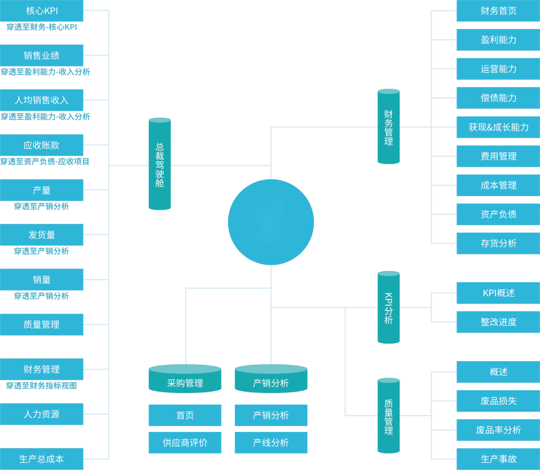 本項(xiàng)目整合業(yè)績(jī)、成本、費(fèi)用、客戶、產(chǎn)品等業(yè)務(wù)場(chǎng)景,提煉200+業(yè)務(wù)指標(biāo),輸出300+底層數(shù)倉(cāng)表。結(jié)合平衡積分卡劃分方式和各層級(jí)用戶劃分,科華控股將前端頁(yè)面分為一級(jí)駕駛艙、二級(jí)看板、三級(jí)明細(xì),并設(shè)計(jì)層級(jí)間跳轉(zhuǎn)鉆取模型。