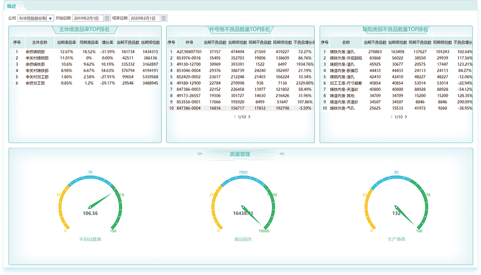 對(duì)于制造業(yè)來(lái)說(shuō),產(chǎn)品質(zhì)量是企業(yè)的生命線,工廠是生產(chǎn)產(chǎn)品的地方,也是直接決定產(chǎn)品質(zhì)量好壞的地方。必須制定一些能夠有效衡量流程及實(shí)施成果的指標(biāo),以確保行動(dòng)實(shí)施的正確性。此外,還必須每隔一定時(shí)間對(duì)收集到的數(shù)據(jù)進(jìn)行評(píng)估, 以檢查流程是否處于控制軌道還是已脫離控制,并在事故發(fā)生前主動(dòng)采取行動(dòng)。包括廢品損失、廢品率分析、生產(chǎn)事故。