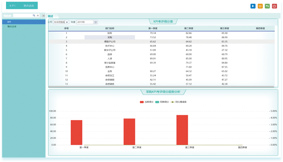 科華控股智能分析平臺(tái)的建設(shè)完成了總經(jīng)理駕駛艙、KPI管理、財(cái)務(wù)管理、質(zhì)量管理和采購(gòu)管理五大模塊的界面,項(xiàng)目工作按照系統(tǒng)設(shè)計(jì)方案中規(guī)定的技術(shù)指標(biāo)和技術(shù)參數(shù),根據(jù)科華控股有關(guān)的要求,完成了系統(tǒng)的建設(shè),為科華控股的公司經(jīng)營(yíng)提供了更加便捷有效的管理方式,并實(shí)現(xiàn)如下管理目標(biāo):