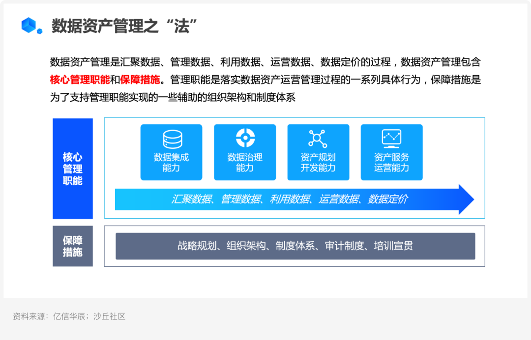 數據集成、數據治理、資產管理等;保障措施是為了支持管理職能實現的一些輔助的組織架構和制度體系。