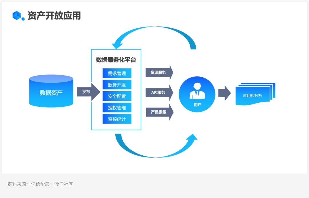 數據資產治理完成后將資產發布到開放平臺上提供數據服務,例如需求管理、服務開發、安全配置、授權管理、監控統計等,實現資產價值。