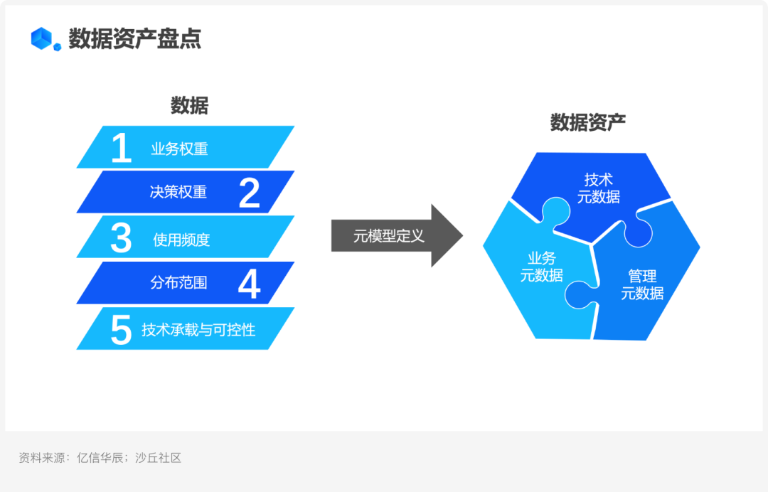 與普通數據不同,數據資產帶有業務價值,能夠體現在后續的業務應用中。因此,在數據資產盤點時,依據業務權重、決策權重、使用頻度、分布范圍、技術承載與可控性五個維度對資產進行綜合判斷: