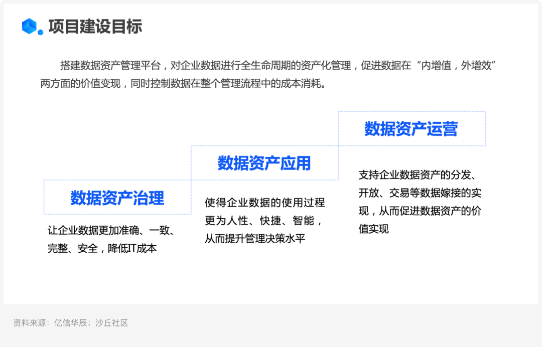數據資產管理平臺,從數據資產的治理、應用到運營,對企業數據進行全生命周期的資產化管理,促進數據在“內增值、外增效”兩方面的價值變現,同時控制數據在整個管理流程中的成本消耗。