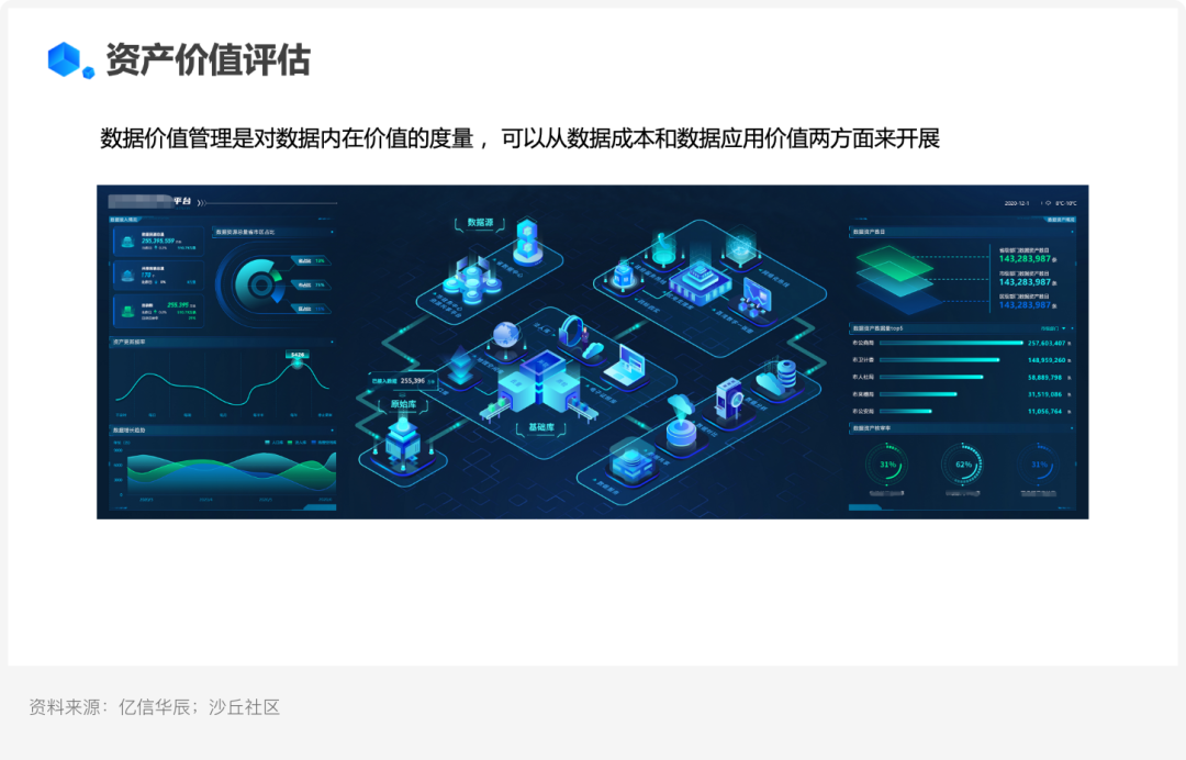 數據價值評估是對數據內在價值的度量,包括成本和應用價值兩個層面。數據成本考慮的是數據丟失的重建成本、非結構化數據的存儲成本等;應用價值主要通過資產的使用情況進行衡量,包括指標、接口、
