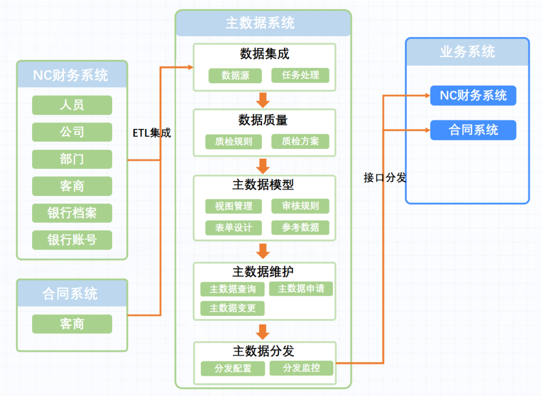主數據管理系統(MDM)為主要目標,實現集團本部合同管理系統、人力資源系統、OA、門戶系統、財務系統集群(預算、共享、資金、核算系統)、采購管理平臺、檔案管理系統的主數據統一管理。