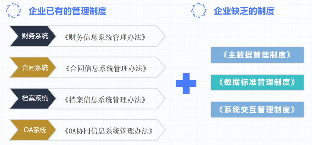 企業缺乏數據管理制度和標準,無法對數據進行有效管控;同時沒有專門的數據管控組織和人員,數據歸口職責部門不明確,造成數據質量差,數據錄入、交互不及時。