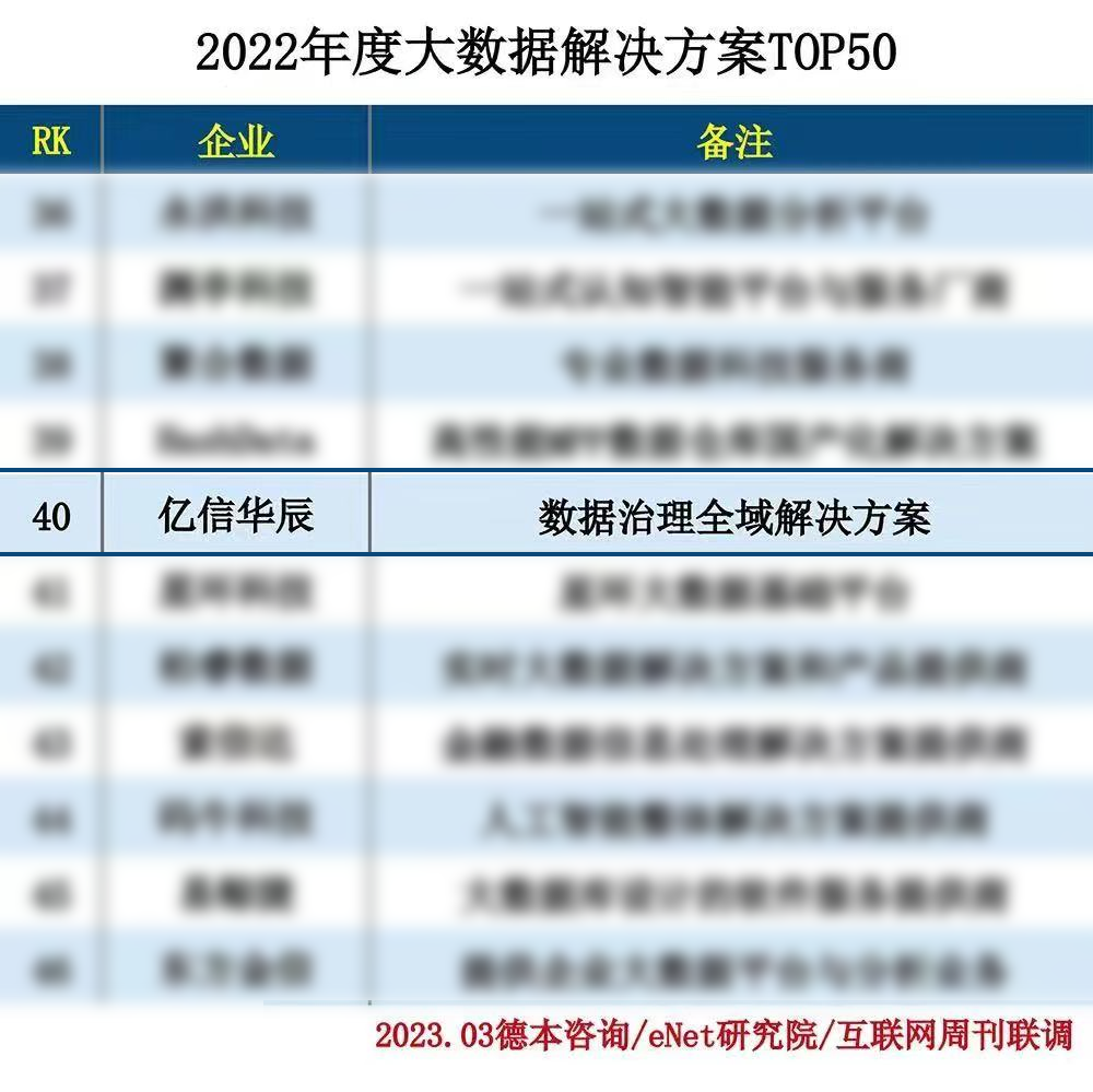 據了解,“大數據解決方案top50”榜單重點關注企業的大數據解決方案是否擁有創新技術、實際應用效果、用戶評價和市場占有率等情況。本次入選,是對億信華辰在大數據領域的創新成果和技術能力給予的高度認可與肯定。