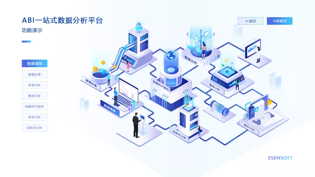 報表分析、圖表分析、炫酷可視化、報告分析、自助分析等核心功能。每個功能,在功能演示demo都內置了豐富的實例展示。