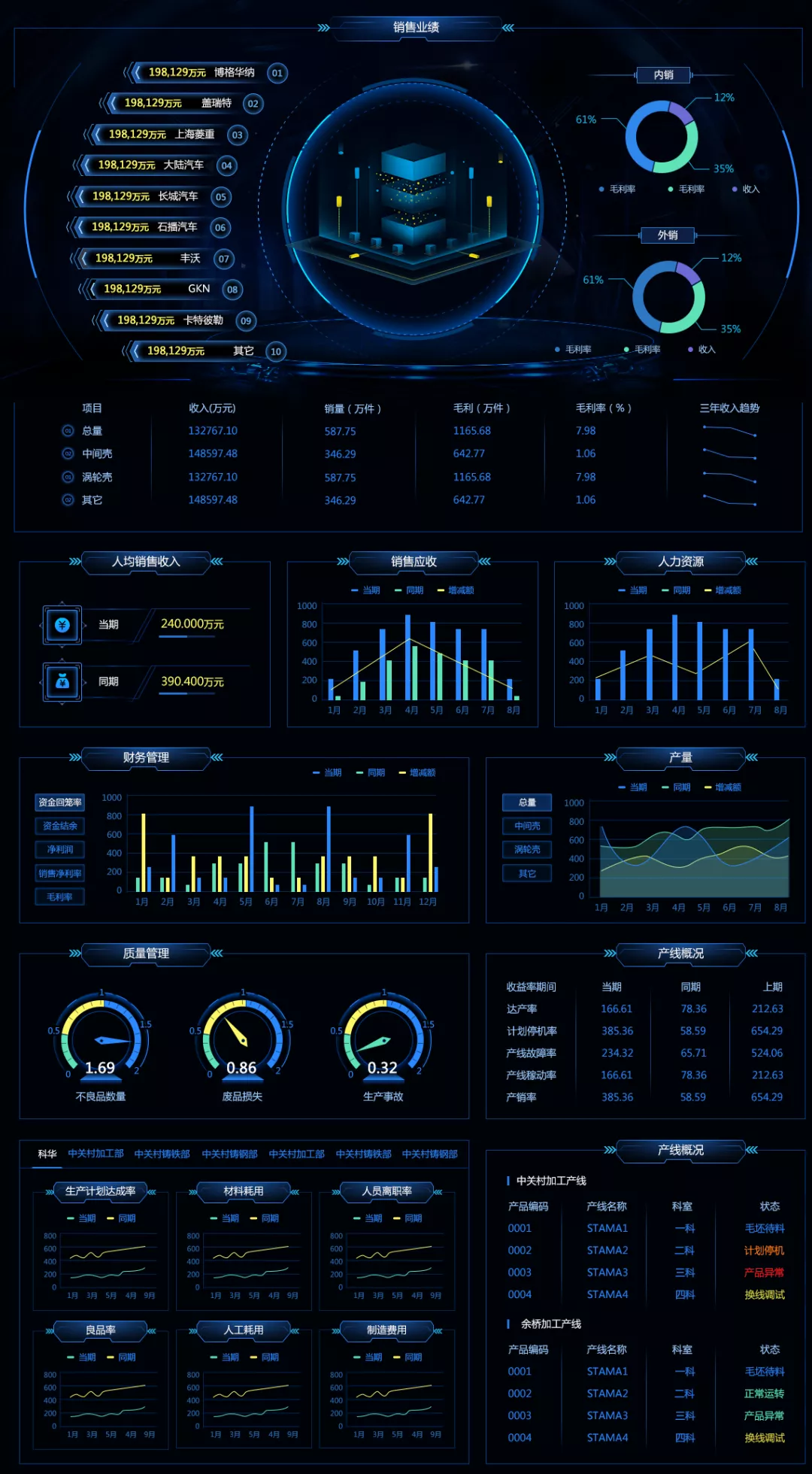 全面匯集生產數據資源形成面向主題的指標體系,包含綜合分析、收入分析、在銷產品、生產指標等分析,為決策者提供系統的數據分析,多維度展現分析結果。