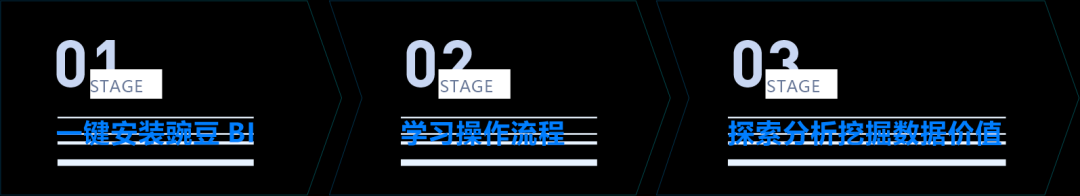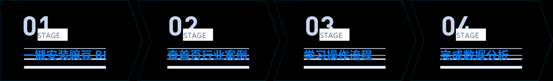 首先采用一鍵安裝的方式,部署無憂,然后進入首頁學習操作流程的幫助引導。由于豌豆BI本身具有上手快和易用的特性,每個流程均在6步以內便可完成,保證了用戶在5分鐘內便可學會數據分析。上手后就可直接實踐啦,用豌豆BI不斷探索價值,漸進明細數據分析。
