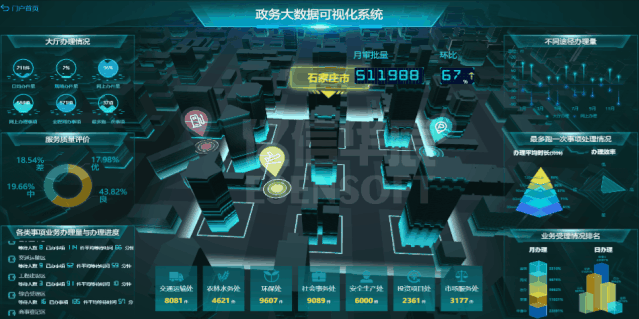 大數據可視化系統,支持整合城市各部門現有信息系統的數據資源,覆蓋各業務領域,實現城市運行態勢監測、建設規劃成果展示、應急監測指揮支持等多種功能,可廣泛應用于監測指揮、分析研判、展示匯報等場景。