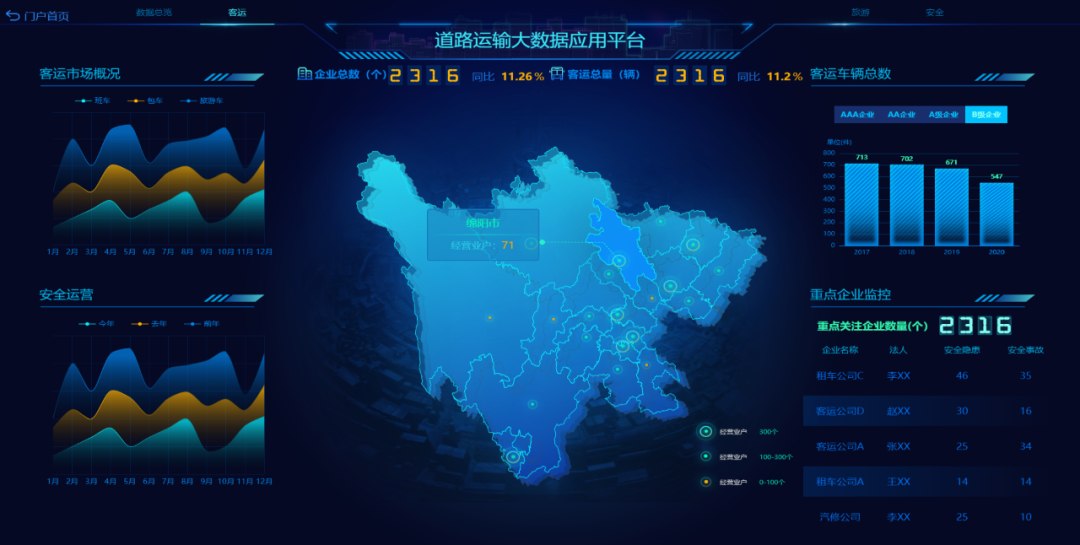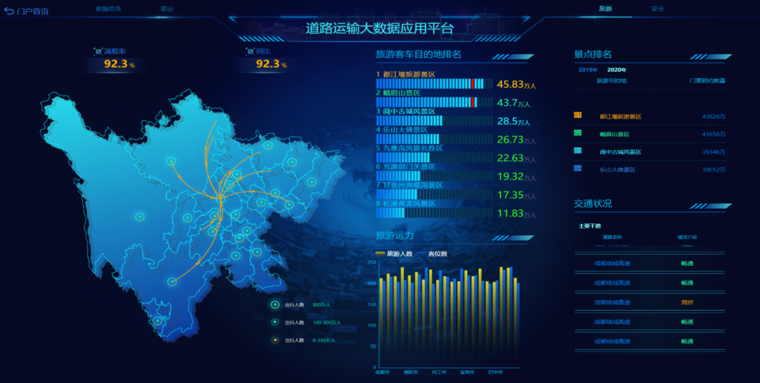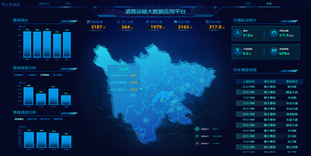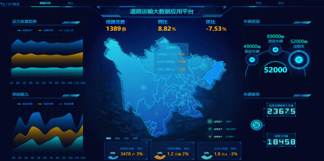 對于交通管理部門來說,利用可視化大屏能為交通管理指揮提供科學的決策支持。由于大屏集成地理信息系統、視頻監控系統、交管部門各業務系統數據,對交通路況、警力分布、警情事件、接處警情況等要素進行綜合監測,能夠幫助管理者實時掌握交通整體運行態勢。