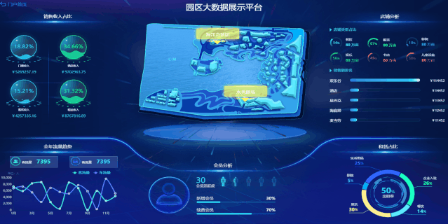 商業綜合體大數據展示平臺可高度融合園區各領域現有數據資源,對園區產業、招商、安防、資產、基礎設施、能效、環境空間等管理領域的關鍵指標進行綜合監測分析,輔助管理者全面掌控園區運行態勢,實現園區人、事、物統一管理,園區綜合運營態勢一屏掌握。