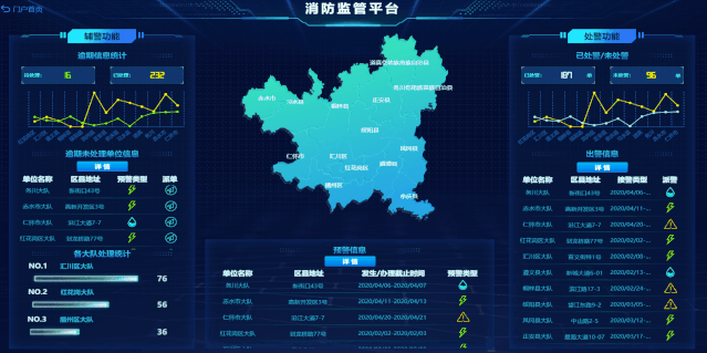 消防監管平臺支持基于時間、空間、數據等多個維度,為各類焦點事件建立閾值告警觸發規則,并支持與火災探測與報警系統、消防聯動控制系統集成,自動監控各類焦點事件的發展狀態,進行可視化自動告警。同時支持對消防部門既有海量數據,按照用戶的業務需求進行多維度并行分析,幫助用戶洞悉復雜數據背后的關聯關系。