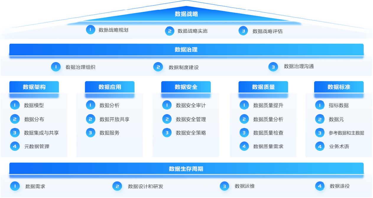 數據管理能力成熟度評估模型》GB/T 36073-2018國家標準,是我國數據管理領域首個國家標準,旨在為我國數據管理體系建設、企業數據管理能力提升提供標準化支撐。該標準的實施,能夠有效規范和指導相關單位提升數據管理水平,充分挖掘釋放數據的價值,幫助企業查明問題、找到差距、指出方向,建設與企業發展戰略相匹配的數據管理能力體系。