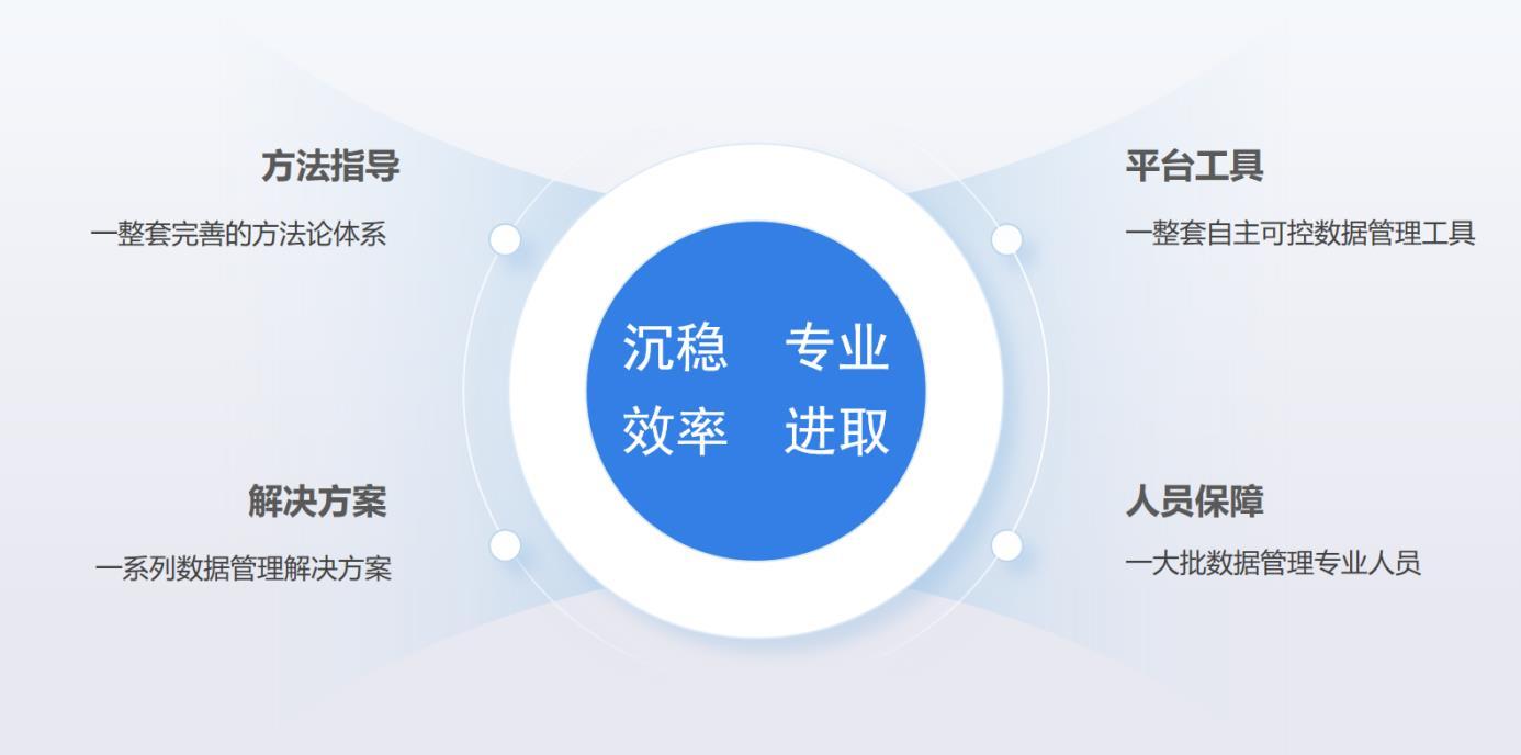 一整套完善的方法論體系:基于DCMM和DAMA數據管理體系,沉淀出成熟、完善且實用的數據管理方法論框架,從指導企業明確自身在數據管理方面的戰略目標,到現狀分析評估,再基于現狀做體系規劃,用工具實現規劃中的各平臺建設,保證實施落地,最后為企業培訓,實現知識轉移。