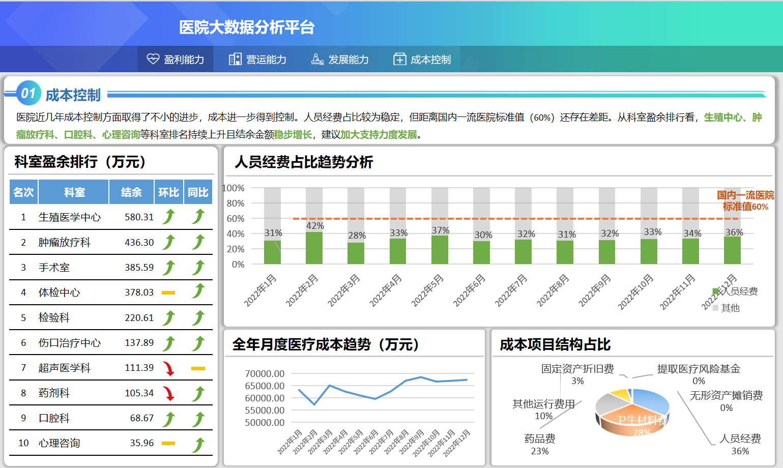 方案提供管理駕駛艙、專科運營分析、預警防控等模塊。管理駕駛艙可進行全院效益分析和全院工作量的實時統計,展現全院門診、急診、住院患者的疾病分布和醫院患者流向分布,用數據輔助院長做好人財物等各方面的管理和決策提升。專科運營分析主要圍繞人力資源、財務、資產、設備、科研、教學等多個專題進行,包括門急診運營、住院運營、手術情況、檢查情況、檢驗情況、藥學指標分析、醫保指標分析等。預警防控則是根據運營分析相關數據,分析事件發展趨勢,與管控目標值比較,及時提出預警,以便及時進行風險研判、評估和制定防控措施。