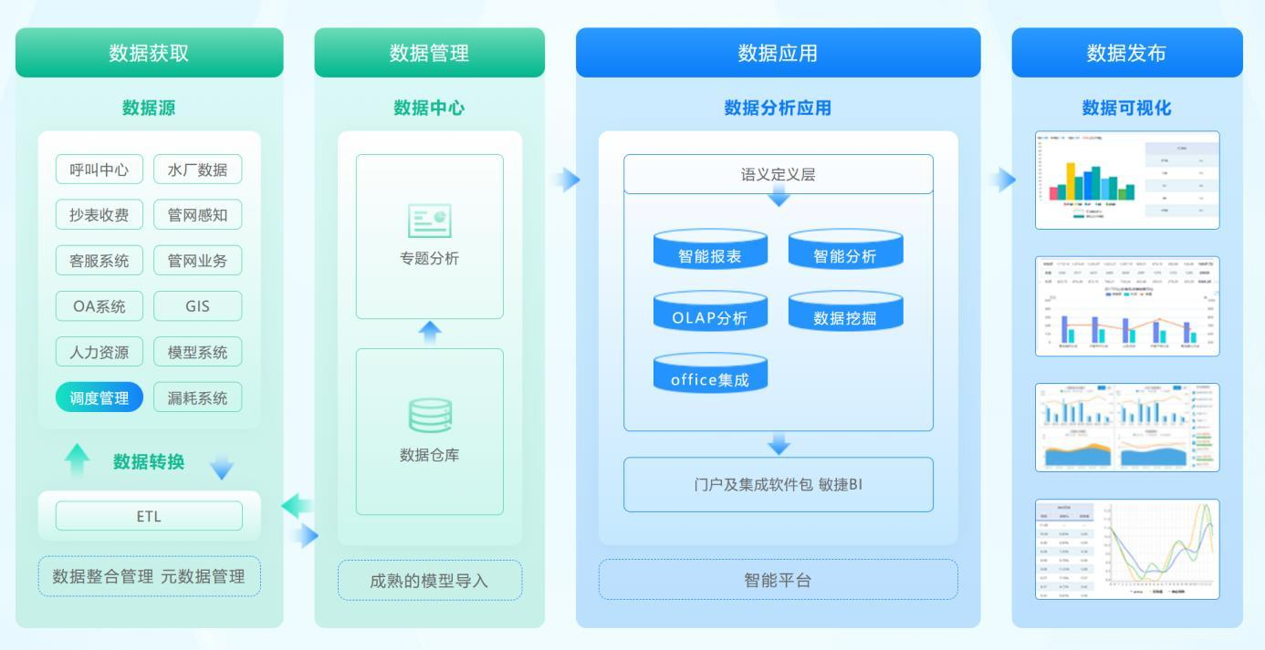 第一步是整合業務系統數據。水務大數據運營分析平臺幾乎匯集企業所有生產經營活動過程中的數據,通過該平臺進行分析與處理,解決各子系統孤立存在、數據無法共通、各個部門的報表重復提交的問題;同時又保證各子系統獨立運行的特點,提高數據統計、分析、應用方面的能力,確保數據提取高效、準確,提高生產辦公效率。