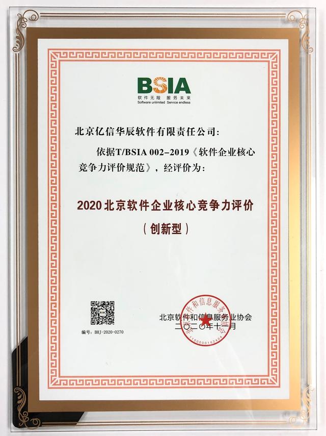今年,北京軟協聚焦北京市軟件和信息服務業內的優秀企業,依據《軟件企業核心競爭力評價規范》(T/BSIA 002-2019),從企業規模、經營業績、研發能力、創新成果、質量保證五個維度進行層層審核,優中選優。最終,億信華辰憑借自身在信息化領域的創新能力脫穎而出,獲得了"創新型"評價。