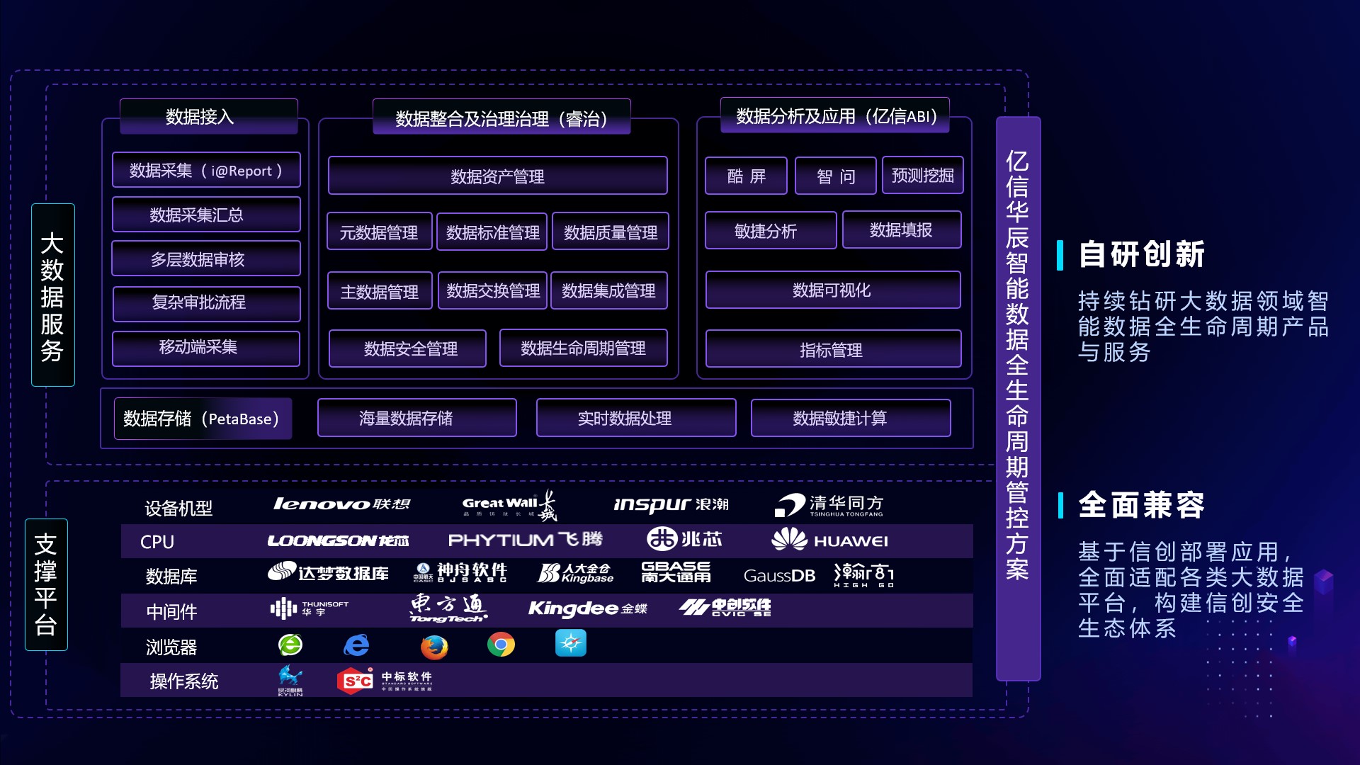 億信華辰作為智能數據產品領航者,成立十多年來一直堅持自主創新,為政企機構提供涵蓋數據的采、存、管、用四大領域的一整套數據創新應用解決方案,積極參與國家數字基建項目建設,助力黨、政、軍及企業用戶數字化轉型、推動國家信創產業發展。