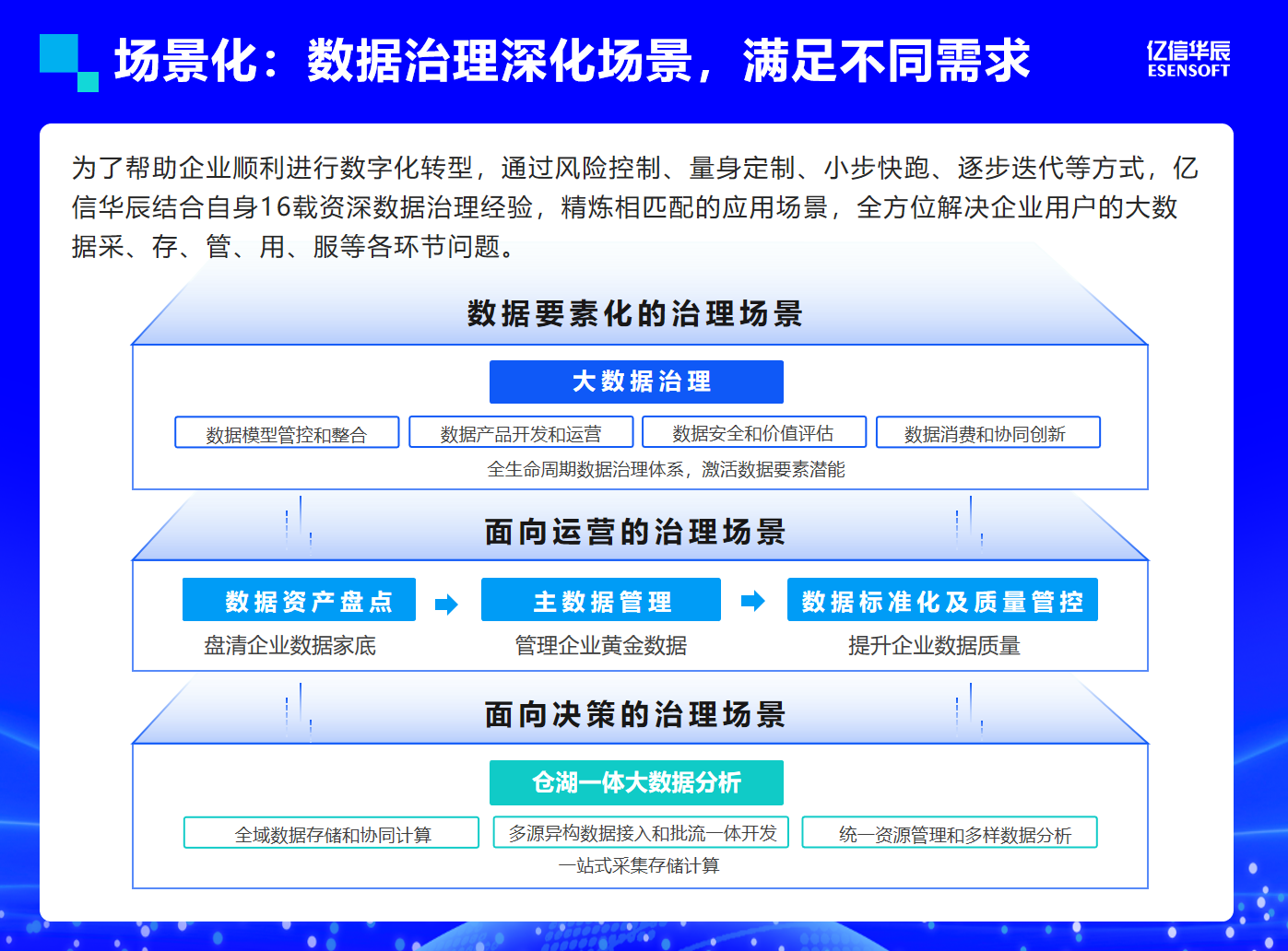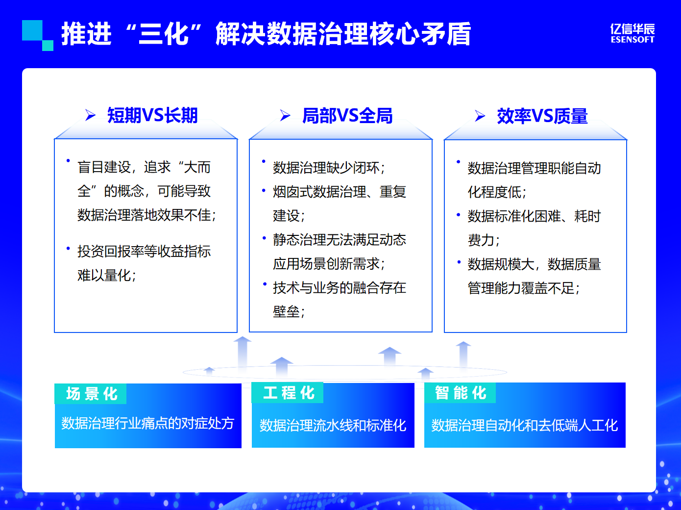 在此背景下,億信華辰作為數據治理領域領航者,為解決政企在數據治理實施過程中遇到的短期VS長期、局部VS全局、效率VS質量等核心矛盾,提出數據治理“三化”理念:場景化、工程化與智能化。其中,場景化是數據治理行業痛點的對癥處方,工程化是數據治理流水線和標準化,智能化是數據治理自動化和去低端人工化。
