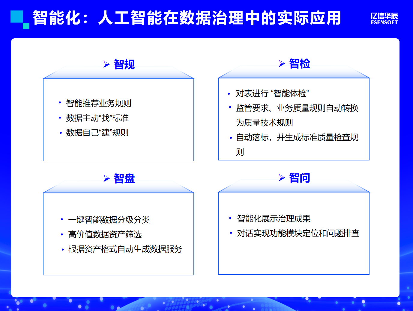 億信華辰總結過去一兩年的實踐,在數據治理中有四個具體的點,可以比較好地應用人工智能相關技術來解決。
