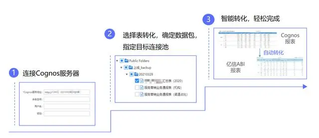 BI軟件,在替代遷移具體解決方案方面,億信華辰特別推出Cognos替代解決方案,完美解決Cognos替代的過程中的難題,實(shí)現(xiàn)Cognos報(bào)表智能轉(zhuǎn)化,只需三步即可完成報(bào)表遷移,輕松實(shí)現(xiàn)