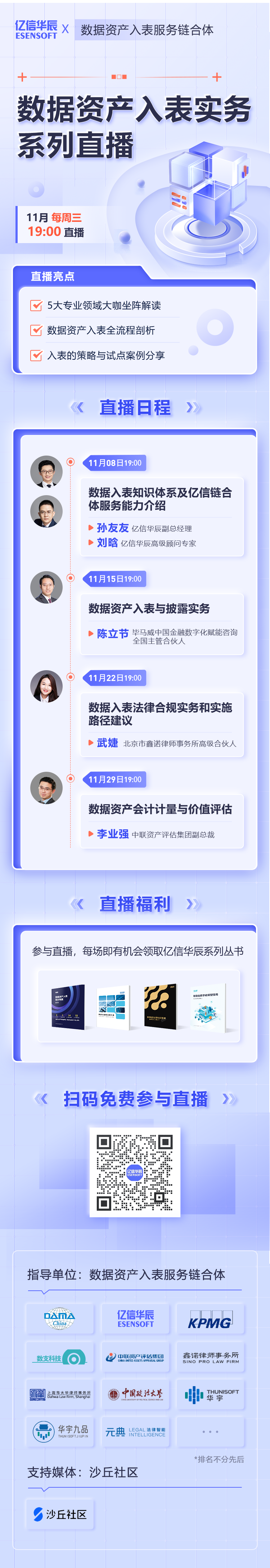 除了行業首發《數據資產入表知識地圖》,給大家進行掃盲式系統歸納知識點,此次億信華辰策劃并推出『數據資產入表實務系列直播』,11月每周三晚上7點,屆時將有5位數據大咖為大家分享數據資產入表的操作步驟、避坑指南,并會帶來實際的試點案例剖析。