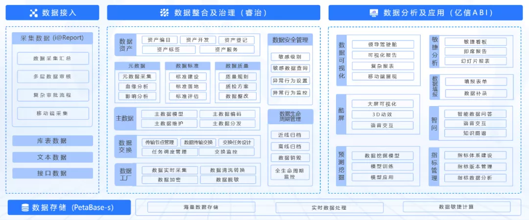 i@Report;基于hadoop框架開發(fā)的企業(yè)級實(shí)時大數(shù)據(jù)平臺——PetaBase-s;覆蓋數(shù)據(jù)全生命周期管理的應(yīng)用平臺——睿治;融合了ETL數(shù)據(jù)處理、數(shù)據(jù)建模、
