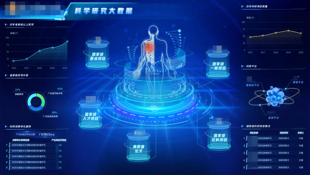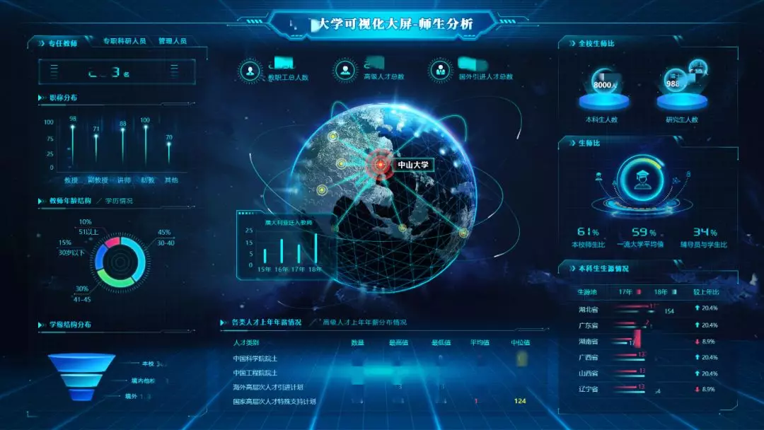 基于億信ABI軟件,中山大學打造可視化大屏項目,可以全局掌握整個學校的學校概況、師資隊伍、教學資源、科學研究、學生發展、就業情況和日常運營情況。通過師生分析,來展現學校的整體的實力,對校內師資力量進行全局展示。通過院系分析,實時掌控院系整體建設情況。通過專業建設分析,掌控全校一流專業設點,雙一流專業的獲獎情況,體現校內校外優勢專業的整體實力。