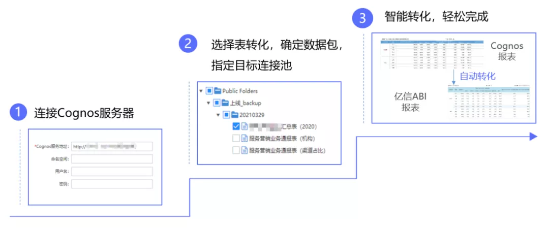 應信創大勢,億信ABI研究出支持將Cognos報表轉化為ABI報表的核心技術,真正實現舊報表無需重做、底層模型無需重建,通過便捷的向導式操作,即可完成存量報表遷移,且遷移后的報表支持查看、二次分析,可節省大量的人力、時間成本。