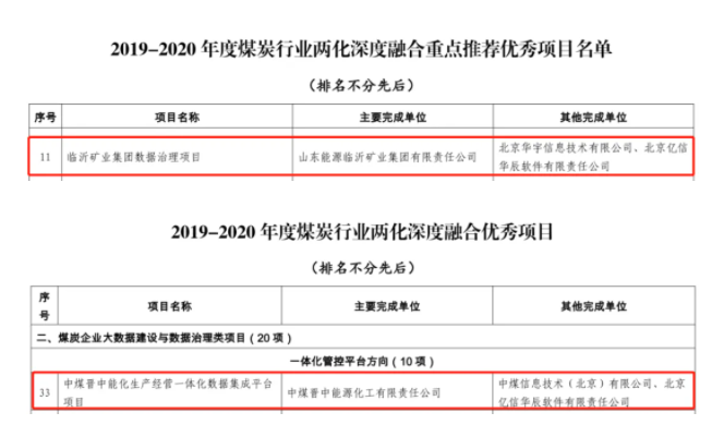 近日,中國(guó)煤炭工業(yè)協(xié)會(huì)發(fā)布2019—2020年度煤炭行業(yè)兩化深度融合優(yōu)秀項(xiàng)目的通知,公布了8類共100項(xiàng)優(yōu)秀項(xiàng)目。億信華辰承建的兩個(gè)項(xiàng)目順利通過(guò)評(píng)審,被評(píng)為優(yōu)秀項(xiàng)目。其中臨沂礦業(yè)集團(tuán)