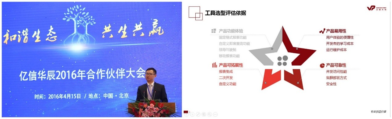 泛鵬天地研發中心副總監顧明勛先生從產品功能、可拓展性、易用性、可靠性等多個維度分享了選擇億信BI的決策歷程。通過BI技術價值在資金轉移定價、資產負債管理、成本分攤/盈利分析等多個銀行分析型管理系統中的成功體現,有效幫助泛鵬天地提升了產品的競爭力,加快了需求響應速度,降低了研發成本。