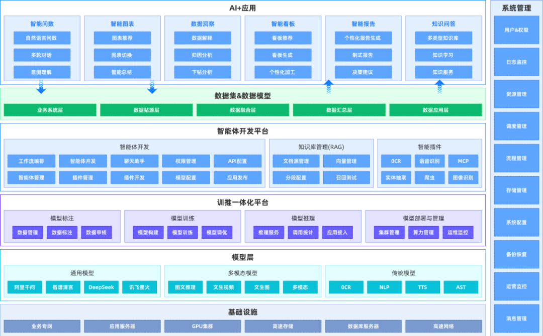該平臺的核心價值在于,它允許企業以低門檻、靈活編排的方式,將經過嚴格治理的高質量數據與前沿的大型語言模型(LLM)能力深度融合,快速構建面向“問數”(數據查詢、分析、可視化)與“問知”(知識檢索、洞察歸納、決策建議)的多樣化場景智能體。這意味著,業務人員無需深諳技術細節,即可通過自然語言交互,輕松駕馭復雜數據,獲得即時、精準的洞察。