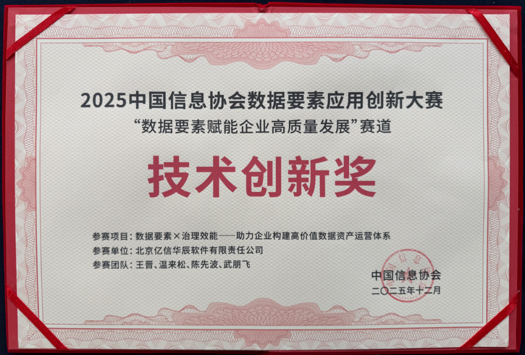 12月19日,由中國信息協會主辦的“2025中國信息協會數據要素應用創新大賽總結發布會”在北京圓滿舉辦。大會以“數據賦能 乘數而上”為主題,集中展示了我國在數據要素市場化進程中的創新成果與實踐力量。億信華辰憑借其《數據要素×治理效能——助力企業構建高價值數據資產運營體系》方案,在本次大賽中榮獲“技術創新獎”,標志著該公司在“數據要素×”國家戰略實施中走在了行業前列,獲得了權威機構的高度認可。