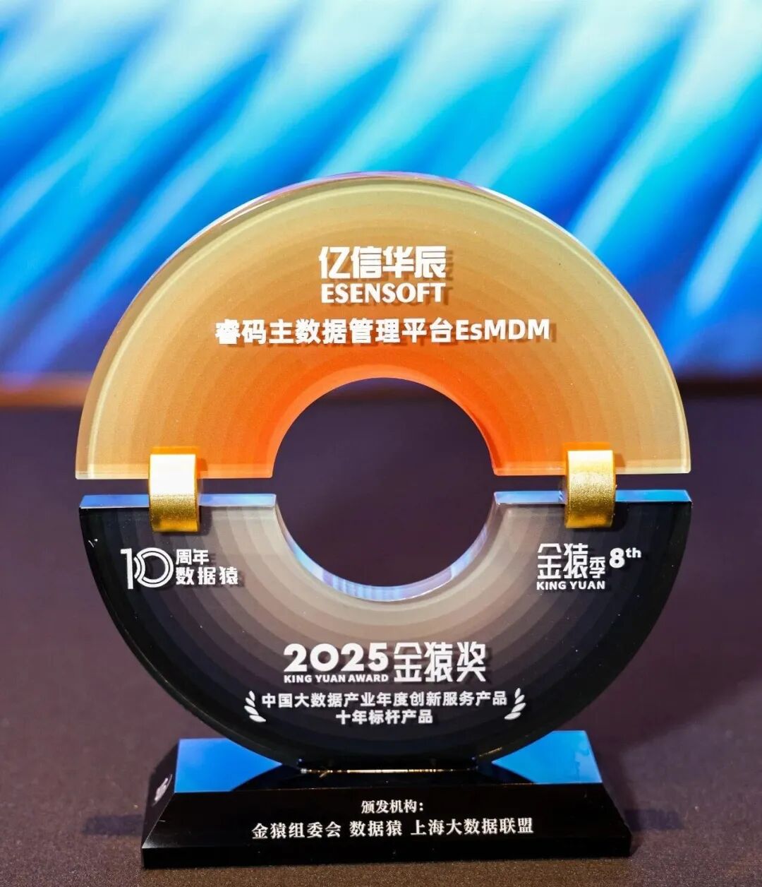 近日,億信華辰睿碼主數據管理平臺EsMDM獲得行業權威認可,榮登由數據猿與上海大數據聯盟聯合推出的《2025中國大數據產業年度創新服務產品——十年標桿產品》 獎項。