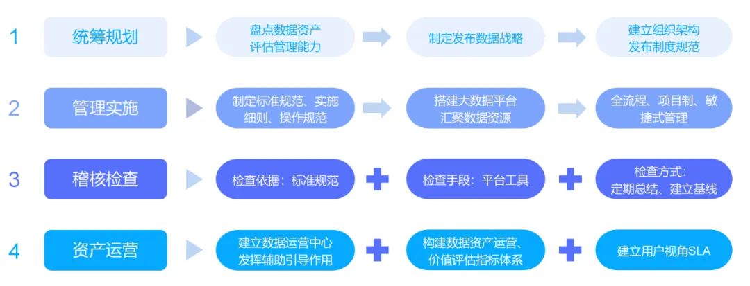 數(shù)據(jù)資產(chǎn)管理實施第一階段是統(tǒng)籌規(guī)劃,包括評估管理能力、發(fā)布數(shù)據(jù)戰(zhàn)略、建立企業(yè)責(zé)任體系三個步驟,為后續(xù)數(shù)據(jù)資產(chǎn)管理和運營錨定方向、奠定基礎(chǔ)。