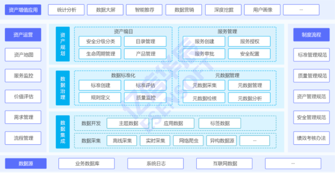 根據(jù)中國信通院定義,數(shù)據(jù)資產(chǎn)管理是指對數(shù)據(jù)資產(chǎn)進(jìn)行規(guī)劃、控制和提供的一組活動職能,包括開發(fā)、執(zhí)行和監(jiān)督有關(guān)數(shù)據(jù)的計劃、政策、方案、項目、流程、方法和程序,從而控制、保護(hù)、交付和提高數(shù)據(jù)資產(chǎn)的價值。