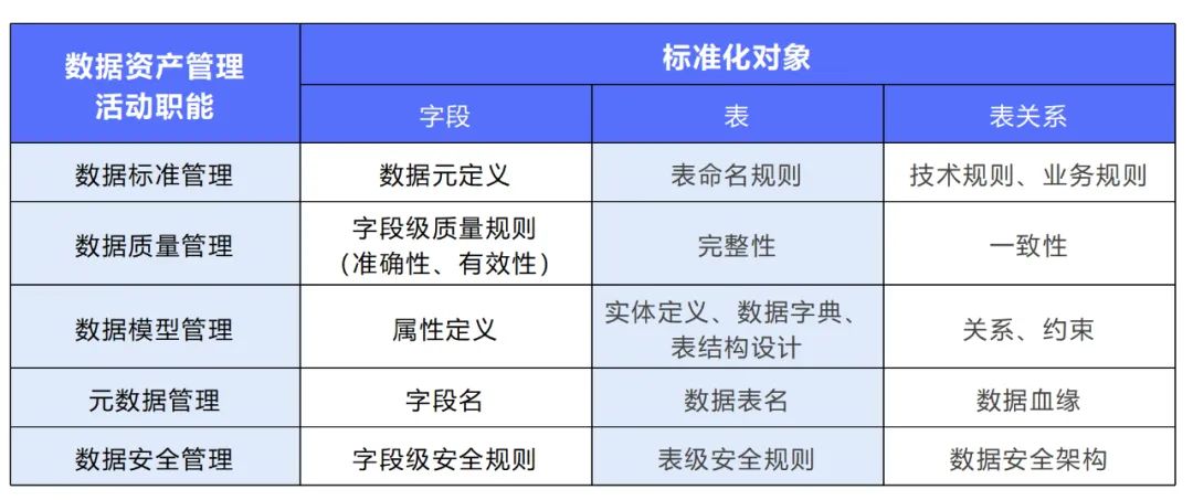 企業(yè)級數(shù)據(jù)資產(chǎn)標(biāo)準(zhǔn)規(guī)范體系指各活動職能下對數(shù)據(jù)技術(shù)設(shè)計、業(yè)務(wù)含義的標(biāo)準(zhǔn)化。以結(jié)構(gòu)化數(shù)據(jù)為例,標(biāo)準(zhǔn)化的對象包括字段、表以及表間關(guān)系,對于各對象的標(biāo)準(zhǔn)化內(nèi)容如下圖所示。此外,結(jié)合數(shù)據(jù)資產(chǎn)管理相關(guān)管理辦法,形成各活動職能的實施細(xì)則、操作規(guī)范,為數(shù)據(jù)資產(chǎn)管理的有效執(zhí)行奠定良好基礎(chǔ)。
