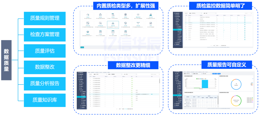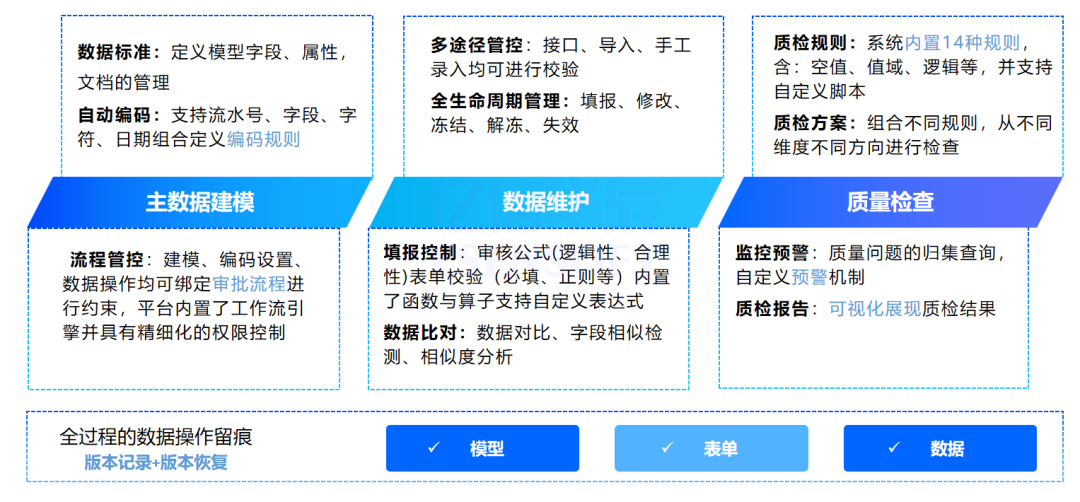 數(shù)據(jù)采集和追蹤、數(shù)據(jù)模型管理和檢查、數(shù)據(jù)標(biāo)準(zhǔn)制定和映射、數(shù)據(jù)質(zhì)量檢核和整改、數(shù)據(jù)服務(wù)開發(fā)和監(jiān)控、資產(chǎn)目錄編制和共享等核心數(shù)據(jù)資產(chǎn)管理活動(dòng)的工具化、持續(xù)化。