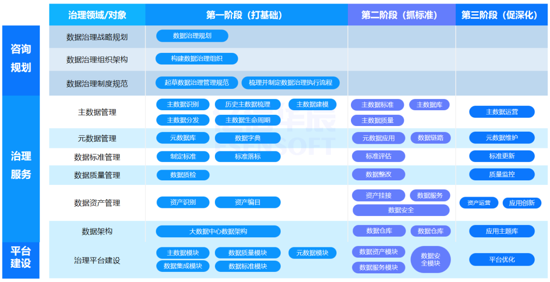 針對(duì)數(shù)據(jù)資產(chǎn)管理體系的規(guī)劃應(yīng)站在企業(yè)戰(zhàn)略層面推進(jìn),數(shù)據(jù)資產(chǎn)管理既要大處著眼,更要小處著手,而且要善于找時(shí)機(jī)切入。比如第一階段重在打基礎(chǔ),第二階段抓標(biāo)準(zhǔn),第三階段促深化,循序漸進(jìn)。一套功能完善、設(shè)計(jì)合理、可擴(kuò)展的數(shù)據(jù)資產(chǎn)管理系統(tǒng)能夠?yàn)槠髽I(yè)數(shù)字化建設(shè)帶來諸多收益。