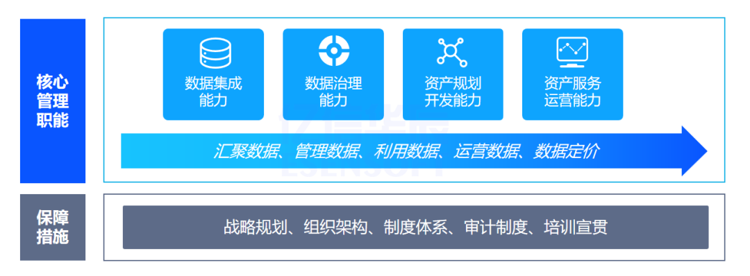 數(shù)據(jù)資產(chǎn)管理是匯聚數(shù)據(jù)、管理數(shù)據(jù)、利用數(shù)據(jù)、運(yùn)營數(shù)據(jù)、數(shù)據(jù)定價(jià)的過程,數(shù)據(jù)資產(chǎn)管理包含核心管理職能和保障措施。管理職能是落實(shí)數(shù)據(jù)資產(chǎn)運(yùn)營管理過程的一系列具體行為,保障措施是為了支持管理職能實(shí)現(xiàn)的一些輔助的組織架構(gòu)和制度體系,是數(shù)據(jù)資產(chǎn)保障長期運(yùn)行的基礎(chǔ)。