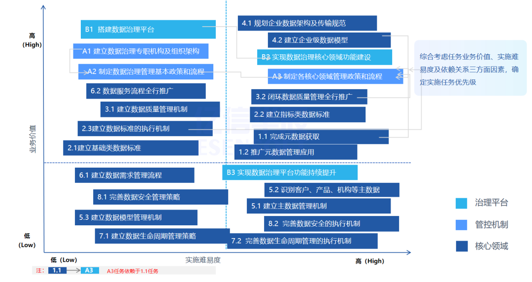 數(shù)據(jù)資產(chǎn)管理不能一蹴而就,需要建立起長效的持續(xù)運(yùn)營機(jī)制,綜合考慮任務(wù)業(yè)務(wù)價(jià)值、實(shí)施難易度及依賴關(guān)系三方面因素,確定實(shí)施任務(wù)優(yōu)先級(jí)。